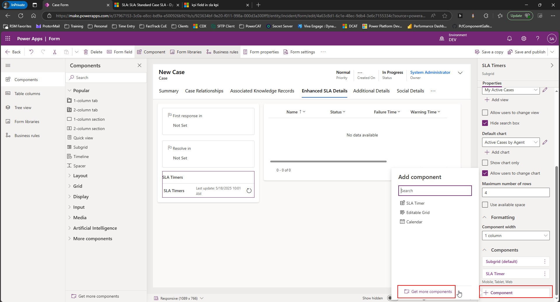If the SLA Timer component is not available, click the Get More Components link