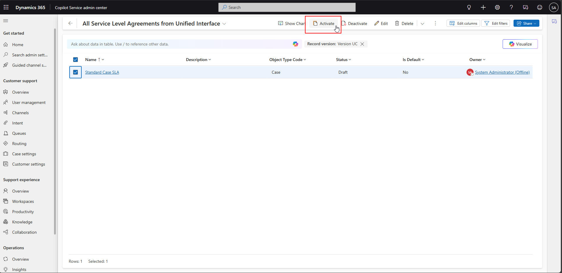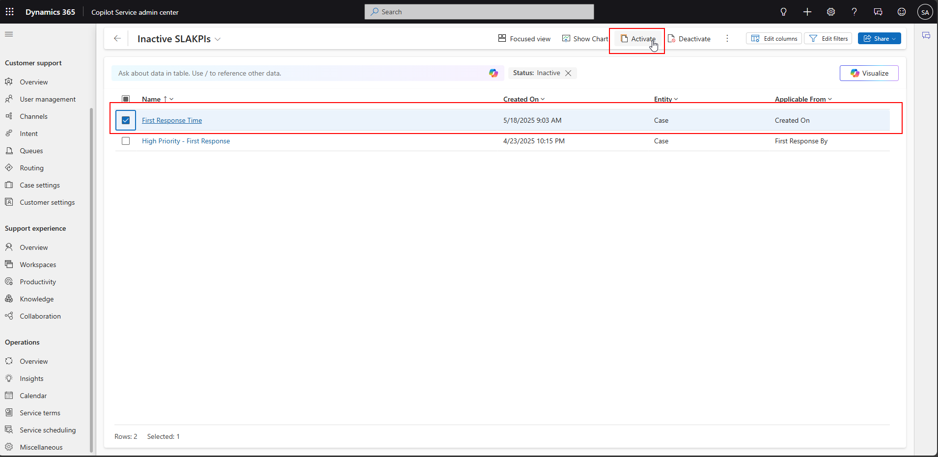 Be sure to Activate your new SLA KPI by selecting the row and clicking the Activate button in the ribbon